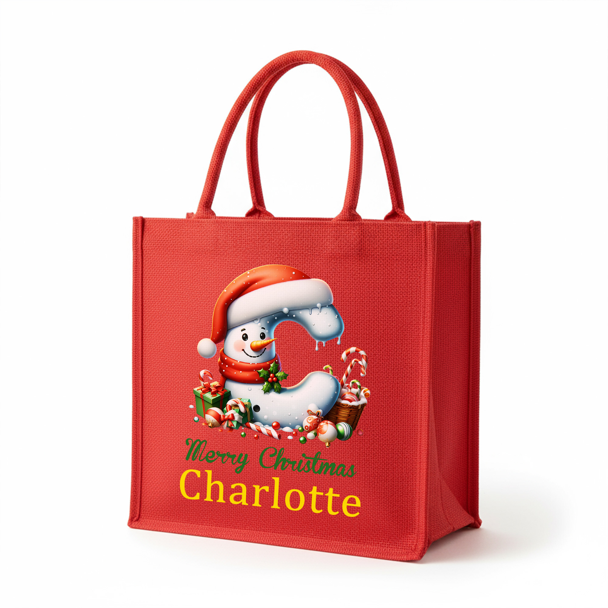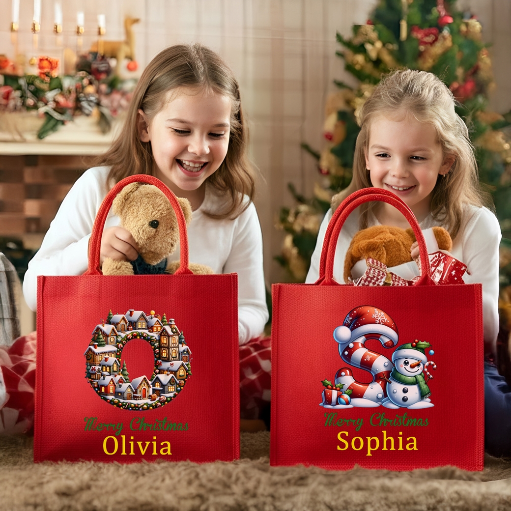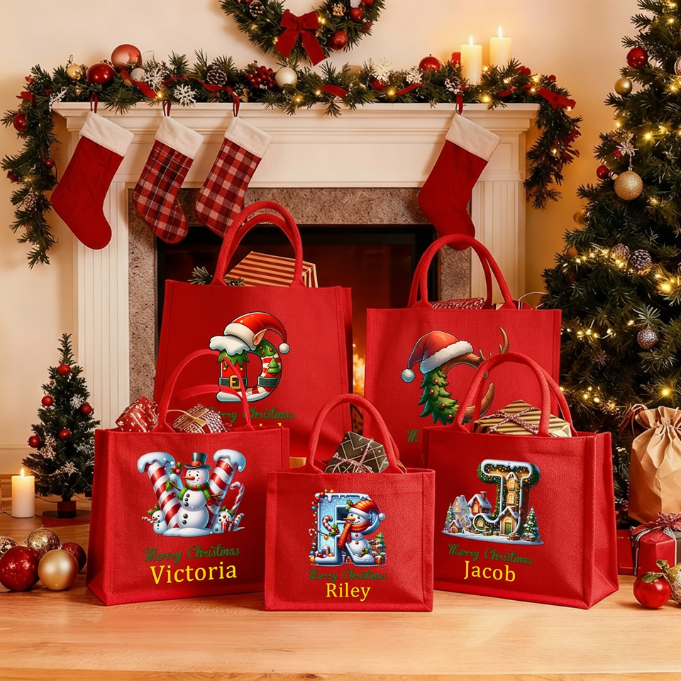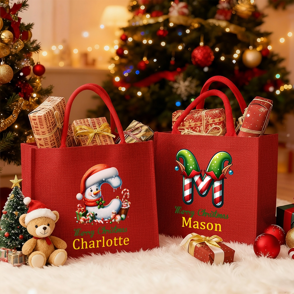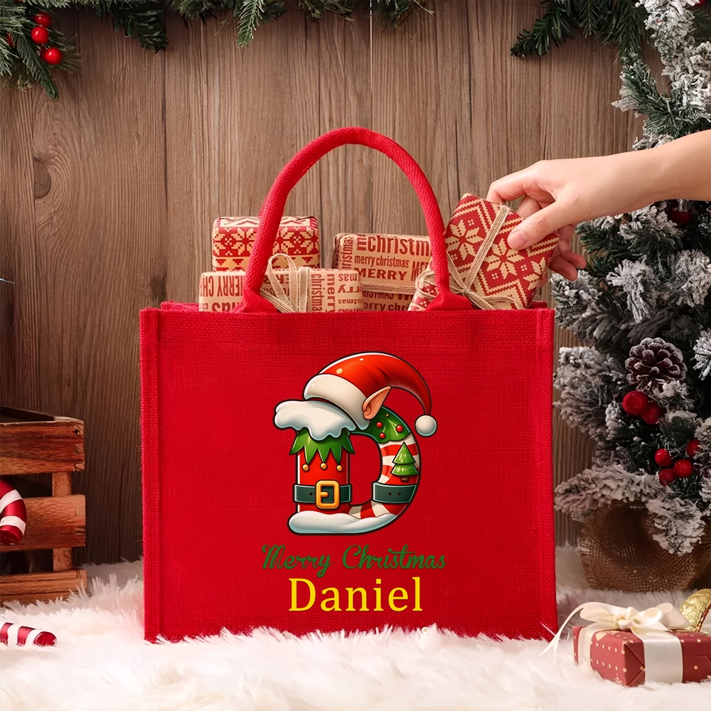 Personalized Name Christmas Elf/Tree/Snowman/House Alphabet Tote Bag, Large Capacity Red Jute Bag, Holiday Party Favor, Christmas Gift for Kids/Family