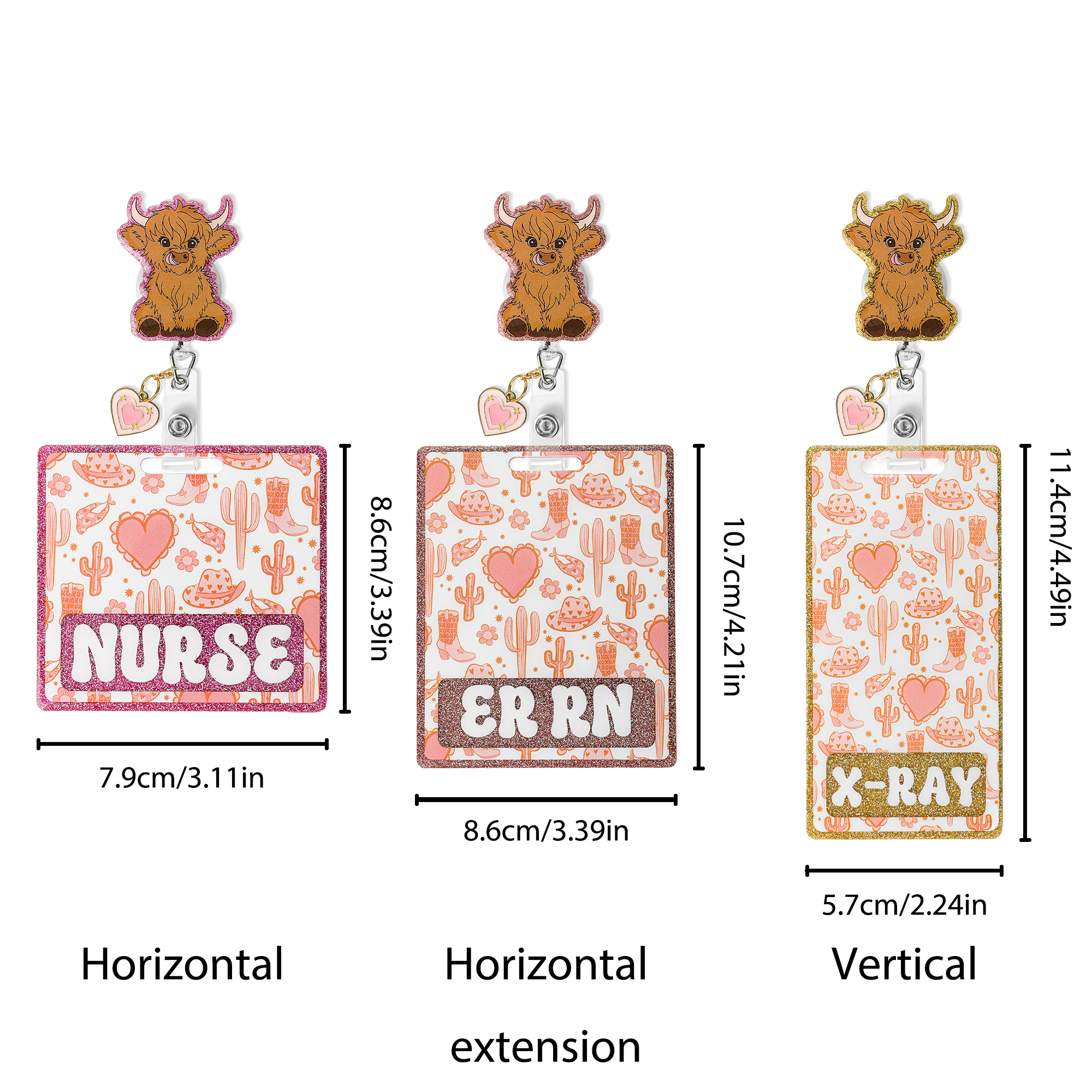 Western Cowgirl Design - This personalized badge reel features an adorable highland cow in a Western cowgirl style, paired with sparkling glitter accents, a small heart charm and a cute daisy touch for added flair. It reflects a fun, free-spirited vibe perfect for anyone who loves rustic charm and cheerful accessories.